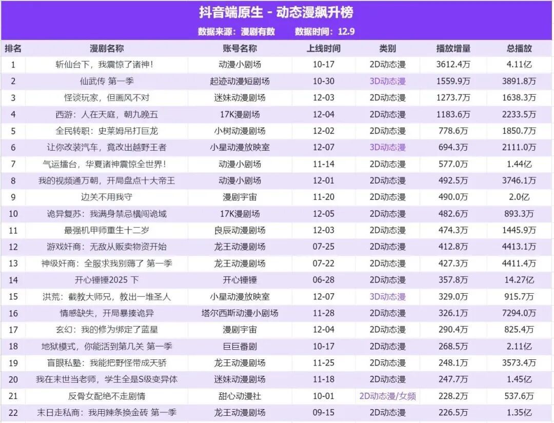 而《斩仙台下,我震惊了诸神》在红果短剧和红果漫剧都稳居榜首,还在刚刚过去的12月斩下了更为惊人的抖音10亿的播放总量。